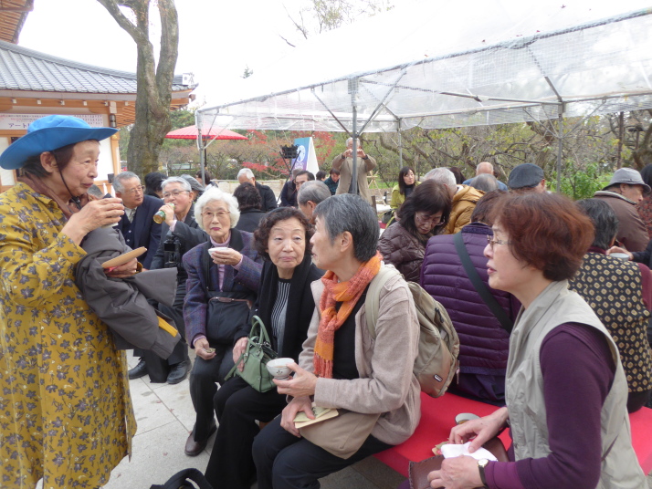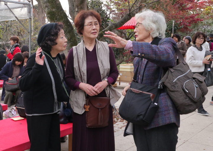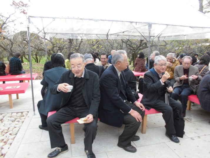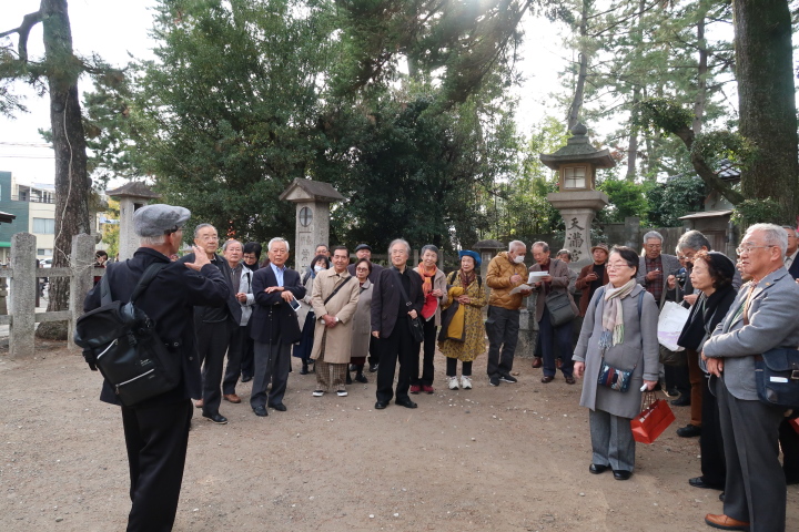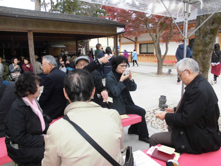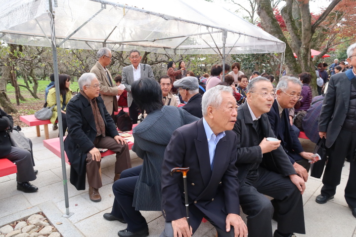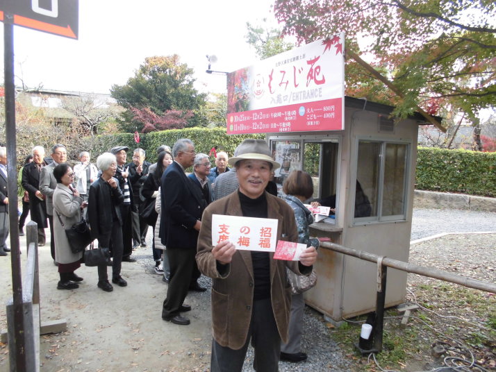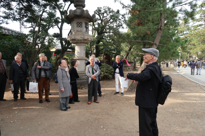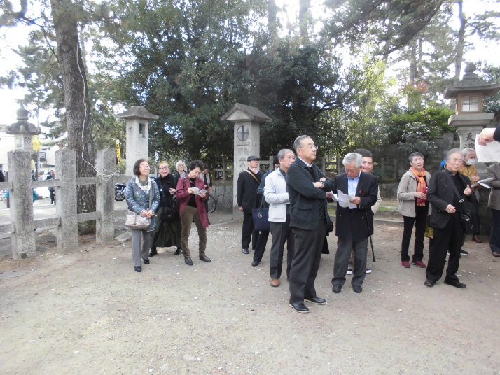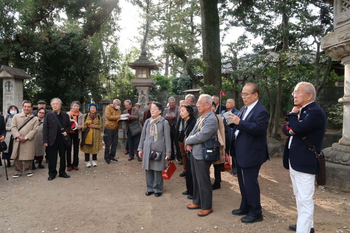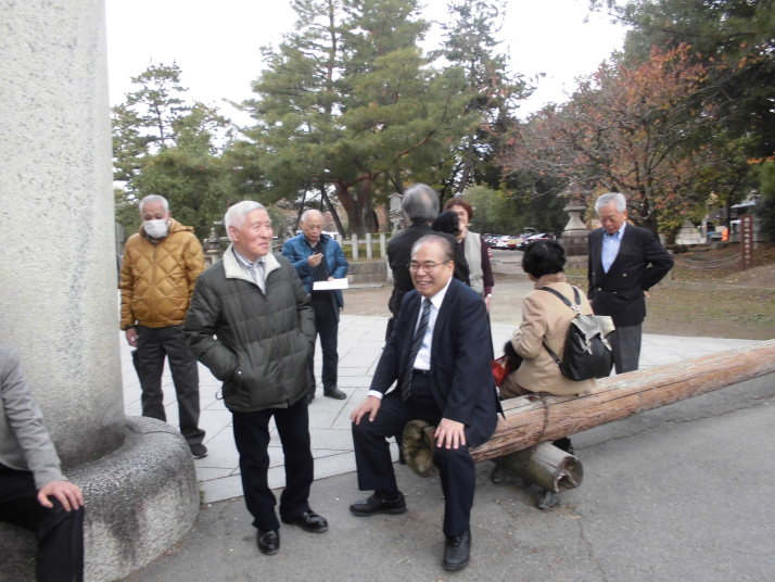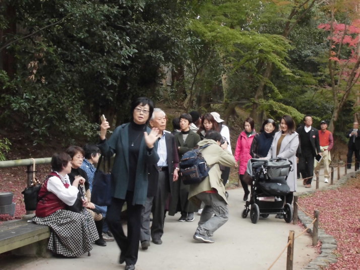 第一部では、北野天満宮を訪ね境内のもみじ苑を散策。小春日和の下、44名の参加者は