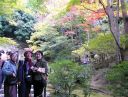 紅葉のみやこ路散策 今年は、東山を歩くということで少し離れていることもあり紅葉狩りには最適の週末ということで、混雑覚悟の出発でした。 こべっこ京都駅到着の11時ごろには、集合場所付近の混雑ぶりは怖いくらいで、散策の前に、はたして全員の皆さんとお会いできるかという心配がよぎりましたが、集合時間を、各自昼食を済ませて12時半にしたのが幸い、又、浪ちゃん考案の目印の旗の効果もあり、時間には全員集合、まずはめでたしでした。 バスも、行列30分待ち覚悟でしたが、やはり昼食時が幸い?1台やり過ごして、全員座れるという幸運に、 幸先のよいスタートとなりました。 京都のバスは、観光地らしく窓が大きく開いていて、周りの景色がゆっくり眺められるようになっています。 座れたことで、40分強の乗車時間も、却って美しい町並みや神社仏閣を眺めることが出来たり、めずらしい地名など見つけたりと、思わぬ楽しみを頂きました。 そうしているうちに銀閣寺に到着。 ここからは、浪ちゃん考案の旗(伸縮性の差し棒に、真っ赤なクリスマスリボン)が大活躍。 岡崎、坂村、地元組みの男性お二人がこの可愛い目印を持ってくださり、アンバランスの妙に、目印効果大で、 混雑の中最後まで迷うことなく、全員移動できました。 銀閣寺は、よく手入れされた苔と、様々な色の木々の織り成す風景が素晴らしく、思わずシャッターパチパチ押していました。 次は、琵琶湖疎水分流沿いの小路、「哲学の道」散策です。 時間もちょうど3時ごろ、出発地点から少し歩いたところにあるカフェで、水分休憩をとりました。 拝観料、地下鉄の料金など徴収させていただき、世話人、小河内山田盛両君には、一足先に切符を買っていただき、私達は、ゆっくりおしゃべりなどしながら、ぶらぶらと楽しませていただきました。 途中、見事な水鳥がいて、デコイとして売られている色そのままの、あまりの美しさに、名前が・・・ おしどりでしょう。いや、もっと違う名前のような・・・で、結局、誰かそのうち思い出して。ということで その場を過ぎましたが、やはりあれは、おしどりでした。それにしても、美しかった。 それから、道沿いのお宅に、またまた見事なエンジェルス・トランペットを見つけました。 紅葉だけでなく、様々な楽しみを提供してくれた疎水沿いの小路に感謝です。 哲学的な思索は、この際置いておいて・・・ 今日のハイライト、紅葉の永観堂に到着です。 先乗りでチケット買って下っていたおかげで、すぐ中に入ることができ、お庭の見事な紅葉だけでなく、 浄土宗西山禅林寺派の、美しくも重厚なお堂内、そして、ご本尊の見かえり阿弥陀像も、ゆっくり見学させていただくことが出来ました。 唐門と、その前の、掃き目模様の美しい、よく手入れされた白砂のお庭。 京都の町が一望できる多宝塔からの眺め・・・等々楽しんで、さあ、第2部の会場に! わが同期の皆様は、世話人の細かい集合時間の指示にも、文句も言わずによく従って下さいまして、ここまで、 要所要素10分くらいずつ予定より早めに行動することができました。 では、早めに会場に行って少しゆっくり致しましょう。ということで、世話人小河内君には、先に会場に 行っていただきましたので、山田くん、八幡さんに、地下鉄の駅まで先乗りしていただいて、切符を買っていただくことになっていました。 ここで、思わぬハプニング! なんと、下見をした3人(小河内、八幡、宮川)とも、相談したように、南禅寺から蹴上げ駅への道を、 最初の入りを反対に行ってしまって、途中で引き返すというミスを犯してしまい、結局、予定通りの 電車に乗って帳尻を合わせてしまったというハプニングなどもありました。 皆様、お疲れのところ、余計に歩かせてしまって、ごめんなさい。 今年は、東から西からの晴れ人たちも、少々お疲れ気味だったらしく神通力も少々弱め、途中少しパラパラきたりしましたが、濡れるほどでもなく会場入りでき、いい時期の紅葉を堪能できたのではないでしょうか。 18名の団体さんでしたが、皆さん、時間や支持をよく守ってくださって、とてもお行儀のよい我が同胞を、誇りに思います。 又来年も、楽しい再開ができますことを、心より祈っています。 朝早くからお出かけくださってご参加いただいた遠来の皆様、何度もいらっしゃっているでしょう地元組みのご参加の皆様、本当にありがとうございました。 最後に、よくまとまってご案内できた世話人チームの皆様、その協力の要であった代表の小河内君、心からお礼申し上げます。 こべっこ154 |