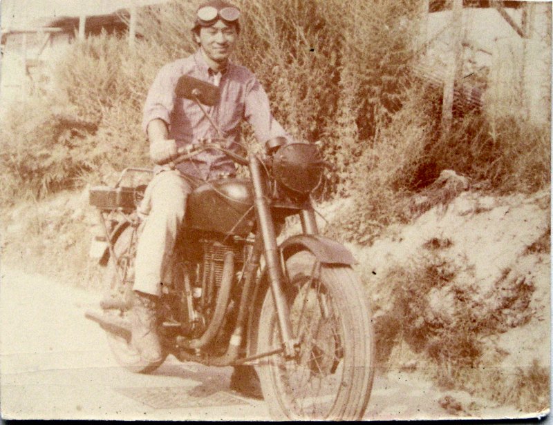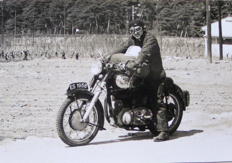 高校時代、リジット(固定式)のリヤサスペンションをものともせず走り回ったマチレス単気筒。 ヘッドライトには国防色のライトカバーを装着。(撮影地/野間苑) |